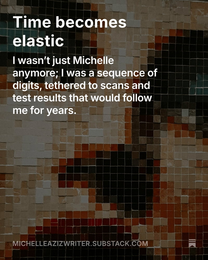 I wasn’t just Michelle anymore; I was a sequence of digits, tethered to scans and test results that would follow me for years.